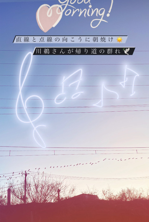 朝焼けの向こうに直線と点線。
